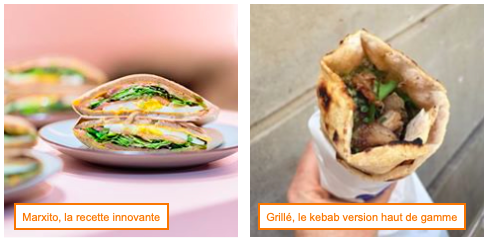 La montée en gamme de la vente au comptoir, passe également par la premiumisation de l’offre de restauration rapide traditionnelle (burgers, sandwichs, salades...). Par exemple, Grillé est un restaurant parisien qui revisite les classiques kebabs et les transforme en un produit haut de gamme grâce à un sourcing minutieux avec des produits d’exceptions comme notamment la viande, un veau de lait sélectionné.