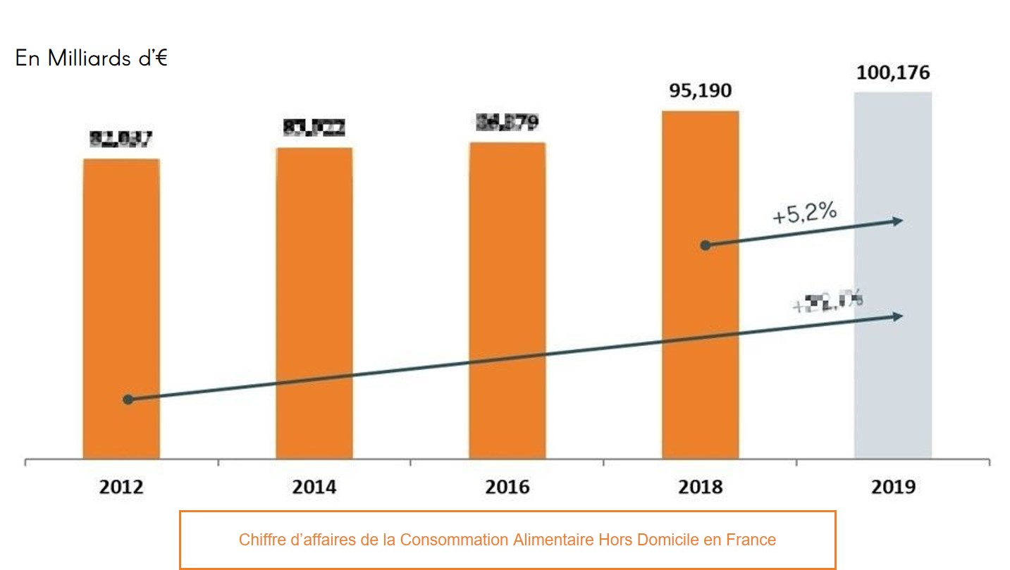 Le marché de la consommation alimentaire hors domicile (comprenant la restauration commerciale, collective, hôtelière et automatique) en France progresse depuis plusieurs années avec une croissance enregistrée de +5.2% entre 2018 et 2019.